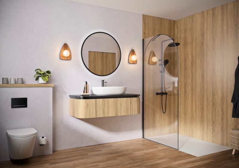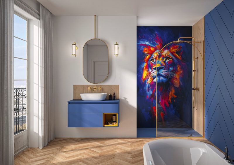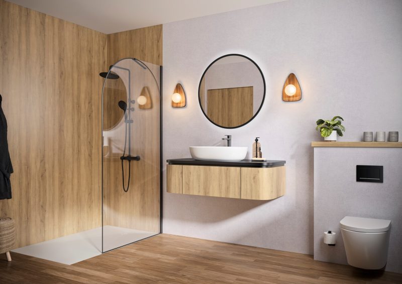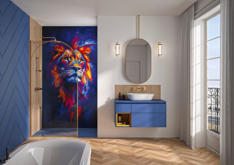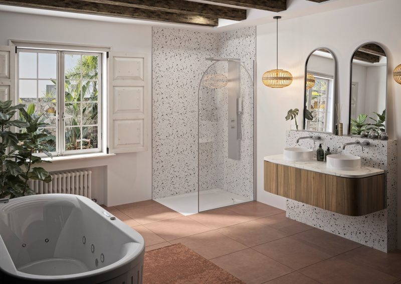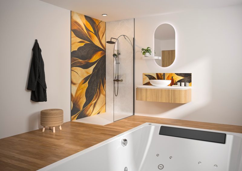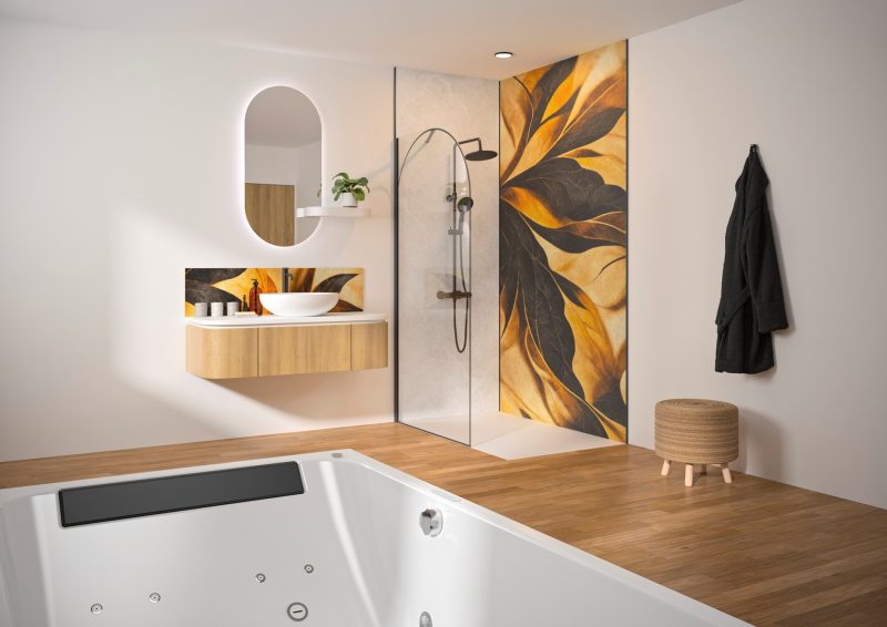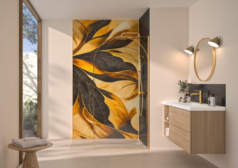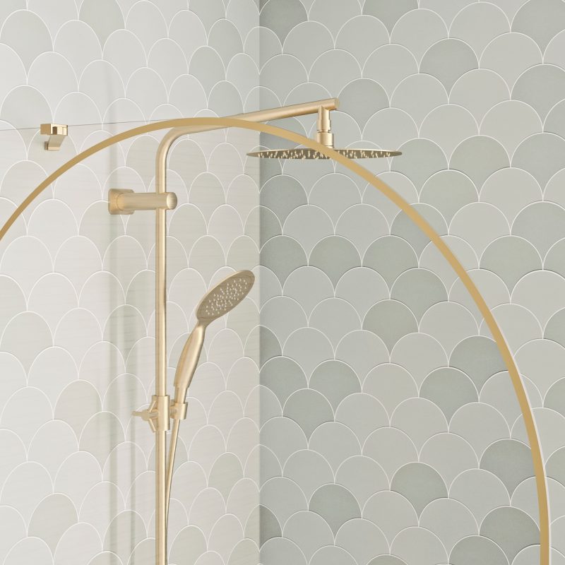 Details Douchewand met afgeronde hoek 6 mm dik glas, voorzien van antikalkbehandeling Glas met boogvormige zeefdruk, afgestemd op het profiel Verkrijgbaar in 4 breedtes, van 90 tot 140 cm Profiel in mat zwart, geborsteld inox of geborsteld goud, met afdekkap Verstelbare stabilisatiestang, afgewerkt in dezelfde kleur als het profiel